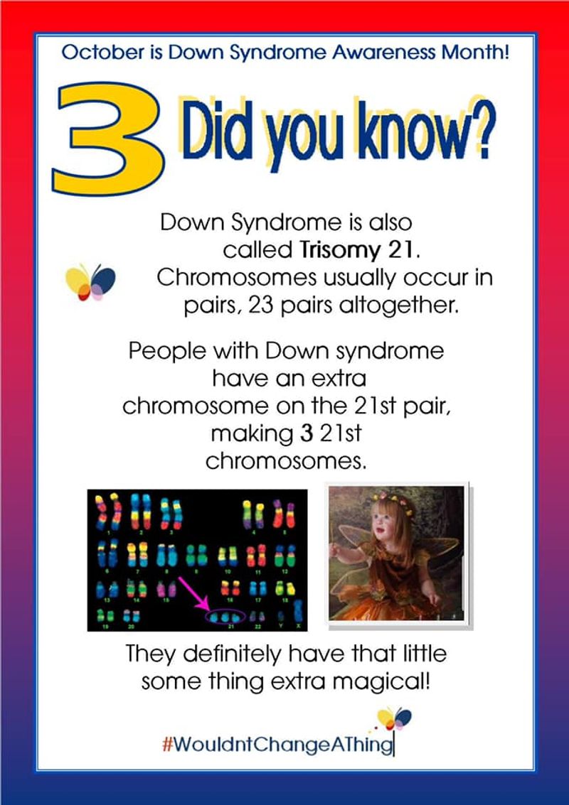 Down Syndrome is also called Trisomy 21. Chromosomes usually occur in pairs, 23 pairs altogether. People with Down Syndrome have an extra chromosome on the 21st pair, making 3 21st chromosomes.